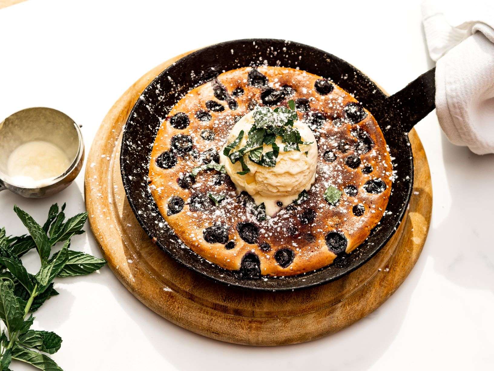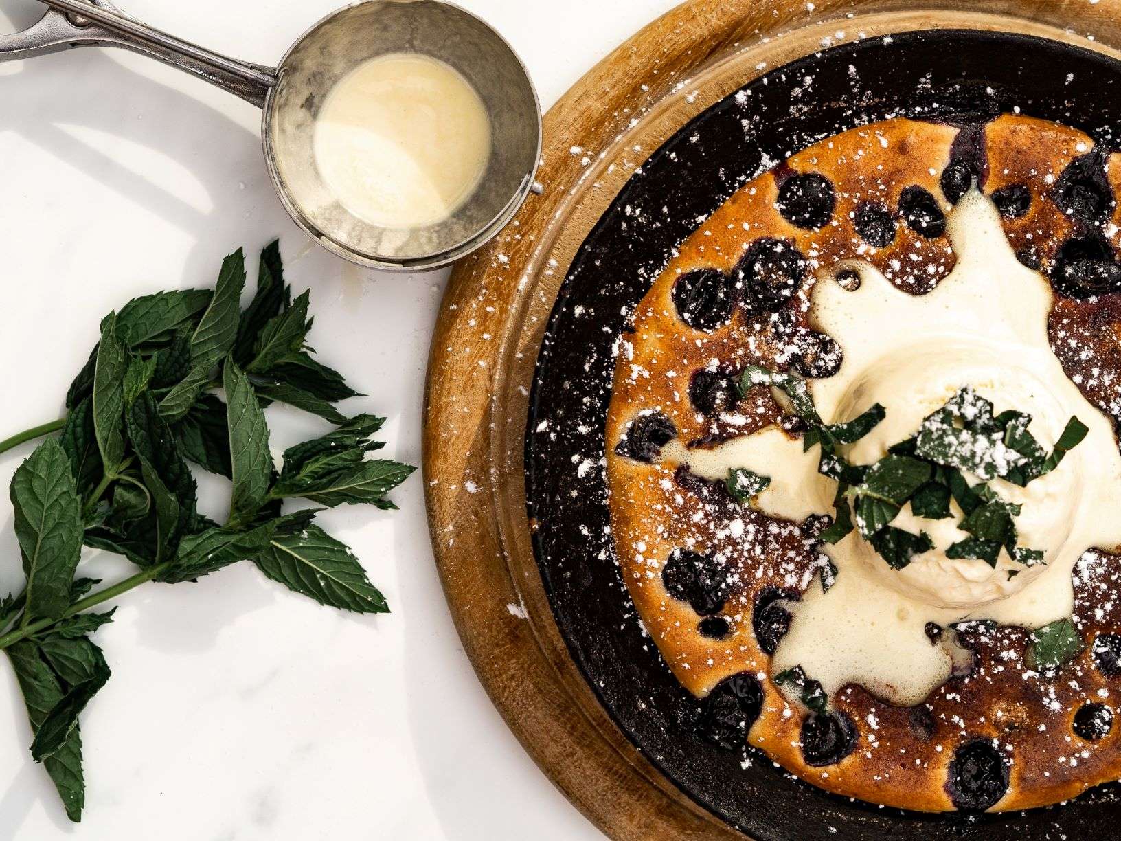 Diesen Spezialpfannkuchen à la Papa, habe ich bereits als Kind geliebt. Super einfach und herrlich lecker. Als Dessert, Hauptgang oder einfach so. Bei dem Teig, handelt es sich erneut um ein klassisches Grundrezept. Je mehr Heidelbeeren Ihr verwendet, desto saftiger wird er. Getoppt mit Vanilleeis und frischer Minze macht der Pfannkuchen nicht nur geschmacklich etwas her.