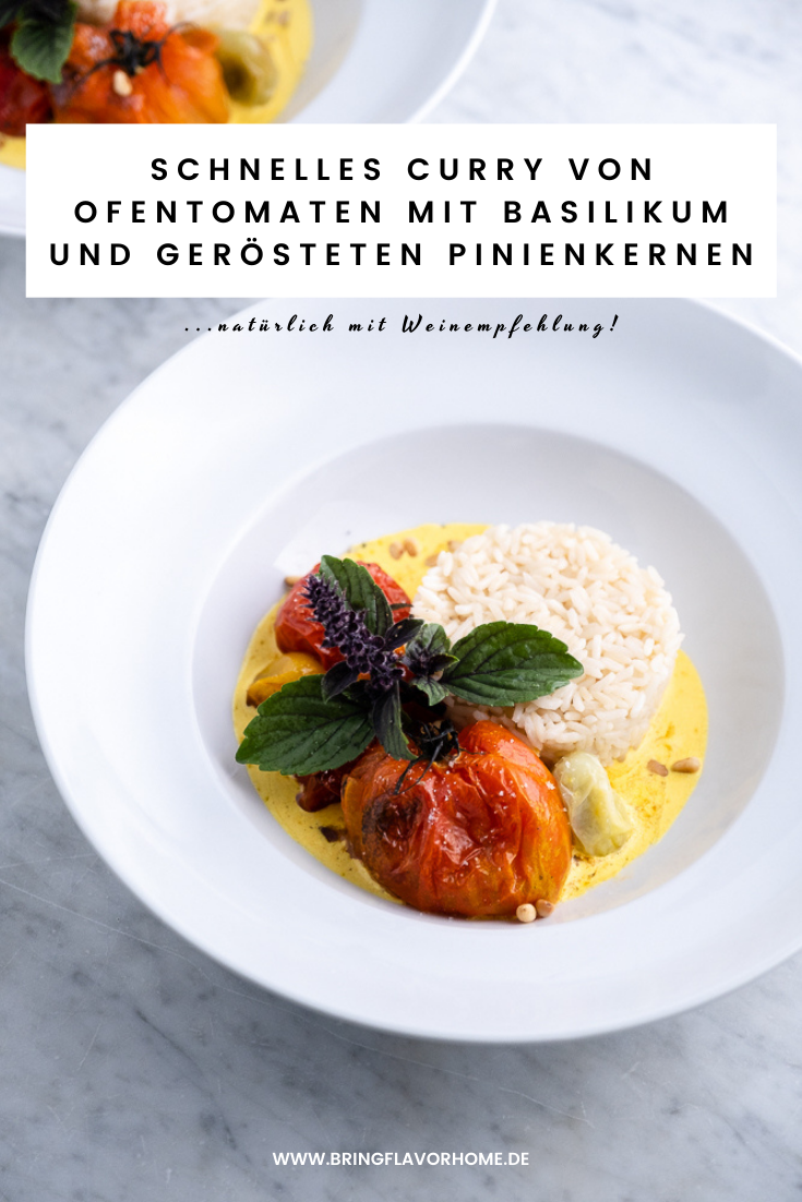 - Die Currysauce auf warme Teller geben, die Tomaten darauf drapieren und mit den gerösteten Pinienkernen und dem frisch gezupften Basilikum garnieren. Dazu passt frischer Basmatireis.