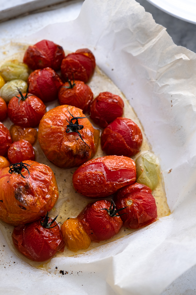 - Den Ofen auf 200° C Umluft vorheizen. Ein Backblech mit Backpapier auslegen. Die gewaschenen Tomaten darauf geben, mit einer Gabel anpiksen, mit etwas Olivenöl beträufeln und mit Salz, Pfeffer und Puderzucker würzen. In den Ofen geben und für ca. 15 – 20 Minuten goldbraun schmoren.