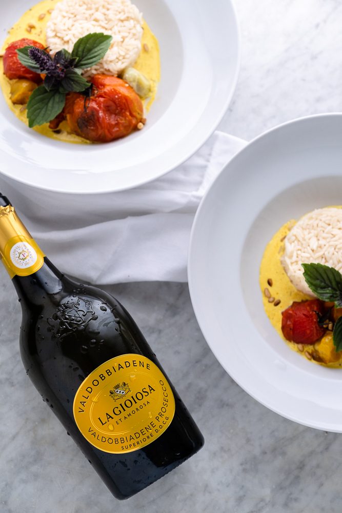 [drop_cap]Big News! Prosecco hat nichts mit Champagner & Co. zu tun – das soll er auch nicht! Bei Prosecco standen schon immer das Spritzig-Fruchtige und die Leichtigkeit des Seins im Vordergrund. Dolce Vita eben, und zwar zum Süffeln. Auch wenn Prosecco von den Sommelier-Snobs dieser Welt mitunter belächelt wird, hat der italienische Klassiker seine Daseinsberechtigung. Insbesondere wenn von Wine & Food Pairings die Rede ist. Denn anders als Champagner & Co. stellt sich Prosecco nicht immer kardashian-like in den Mittelpunkt des Geschehens, sondern ordnet sich auch mal brav unter, und das, ohne an Sexappeal einzubüßen. Er ist eben der Gentlemen unter den Sprudlern. Speziell die Kombination von Prosecco und currybasierten Gerichten ist für mich Gaumensex pur. Die feine Frucht des Schäumers bremst die würzig-pikanten Aromen sanft aus und die feine, klar strukturierte Säure hebt die Aromenvielfalt, von der ein gutes Curry lebt, gekonnt in den Vordergrund. Heimspiel also für eine Flasche eisgekühlten Valdobbiadene Prosecco Superiore DOCG von La Gioiosa und mein Curry von ofengeschmorten Tomaten, gerösteten Pinienkernen und frisch gezupftem Basilikum. Bevor wir uns jetzt aber an den Herd schwingen, ziehen wir uns noch eine ordentliche Mütze geballtes Prosecco-Wissen rein. Auf los geht’s los:[/drop_cap]