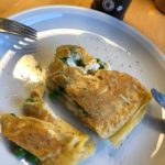 [drop_cap]Dieses Omelett ist der Knaller. Ob zum Frühstück, Brunch oder zur Brotzeit. Für dieses Traum – Omelett, weil so wunderbar fluffig, brauchst du keine 2 Minuten. Die Kombination aus frischer Minze, süßen Erbsen und cremigem Feta ist einfach unschlagbar. Normalerweise wird ein Omelett im Stil eines Pfannkuchens hergestellt – wir nehmen uns ein Beispiel an Crêpes. Wenn du die Eiermasse in die heiße Pfanne gibst, denkst du einfach die ganze Zeit an Crêpes – Crêpes, Crêpes, Crêpes.[/drop_cap] Das heißt wir arbeiten hauchdünn. Sobald die Eiermasse auf den Pfannenboden trifft, fängst du an sie in kreisenden Bewegungen gleichmäßig zu verteilen und ziehst dabei einen schönen hohen Rand. Dann wird unser Crêpe gleichmäßig belegt, an den Seiten mittels eines Gummispachtels gelöst und vorsichtig zusammengeklappt. Et Voila – da ist das Ding.