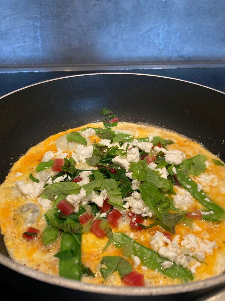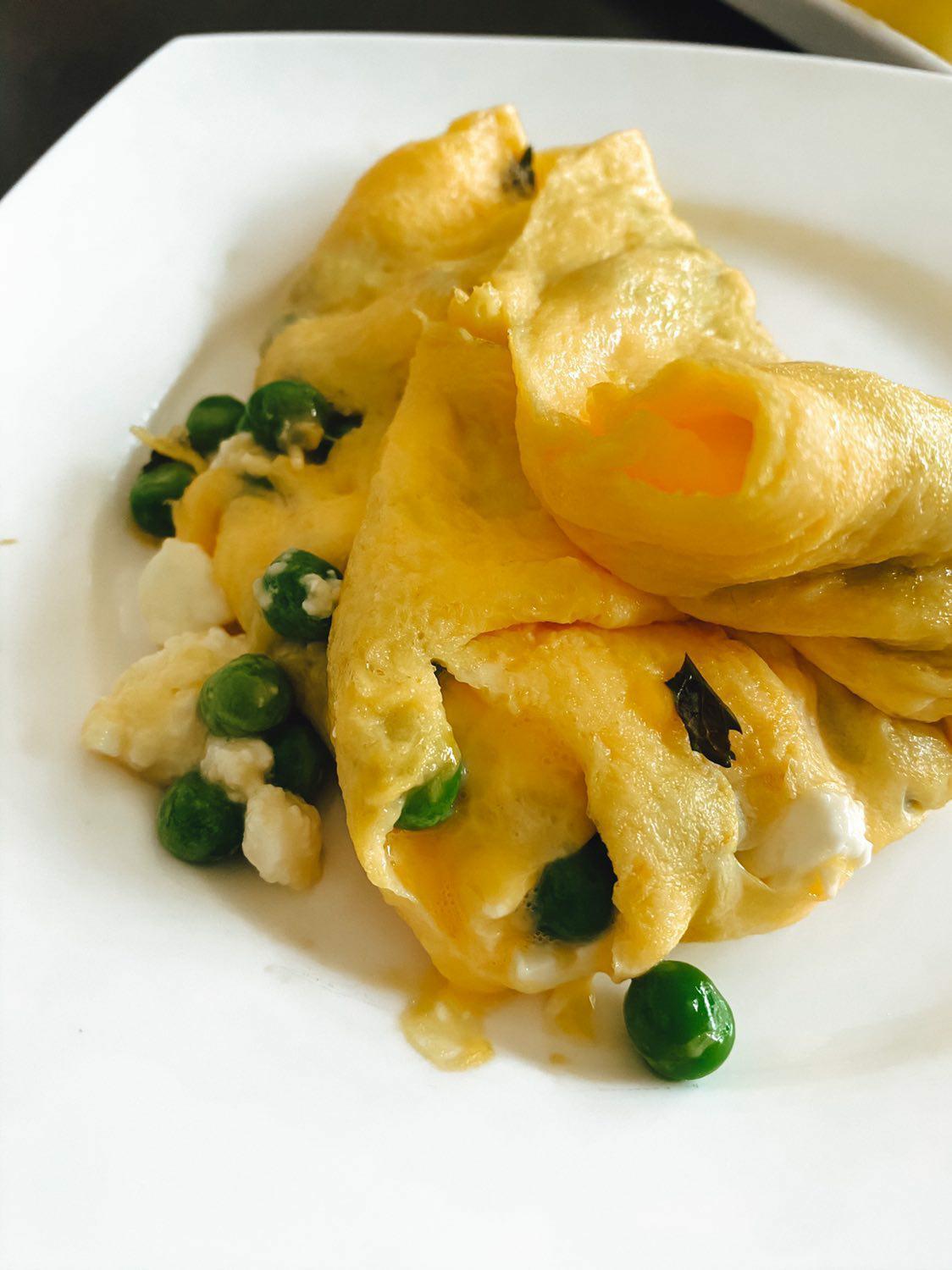[drop_cap]Dieses Omelett ist der Knaller. Ob zum Frühstück, Brunch oder zur Brotzeit. Für dieses Traum – Omelett, weil so wunderbar fluffig, brauchst du keine 2 Minuten. Die Kombination aus frischer Minze, süßen Erbsen und cremigem Feta ist einfach unschlagbar. Normalerweise wird ein Omelett im Stil eines Pfannkuchens hergestellt – wir nehmen uns ein Beispiel an Crêpes. Wenn du die Eiermasse in die heiße Pfanne gibst, denkst du einfach die ganze Zeit an Crêpes – Crêpes, Crêpes, Crêpes.[/drop_cap] Das heißt wir arbeiten hauchdünn. Sobald die Eiermasse auf den Pfannenboden trifft, fängst du an sie in kreisenden Bewegungen gleichmäßig zu verteilen und ziehst dabei einen schönen hohen Rand. Dann wird unser Crêpe gleichmäßig belegt, an den Seiten mittels eines Gummispachtels gelöst und vorsichtig zusammengeklappt. Et Voila – da ist das Ding.