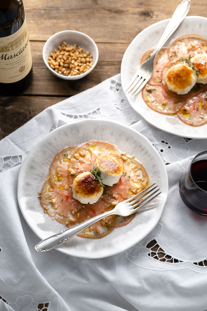 Rezept für mein Tomaten-Carpaccio mit karamellisiertem Ziegenkäse