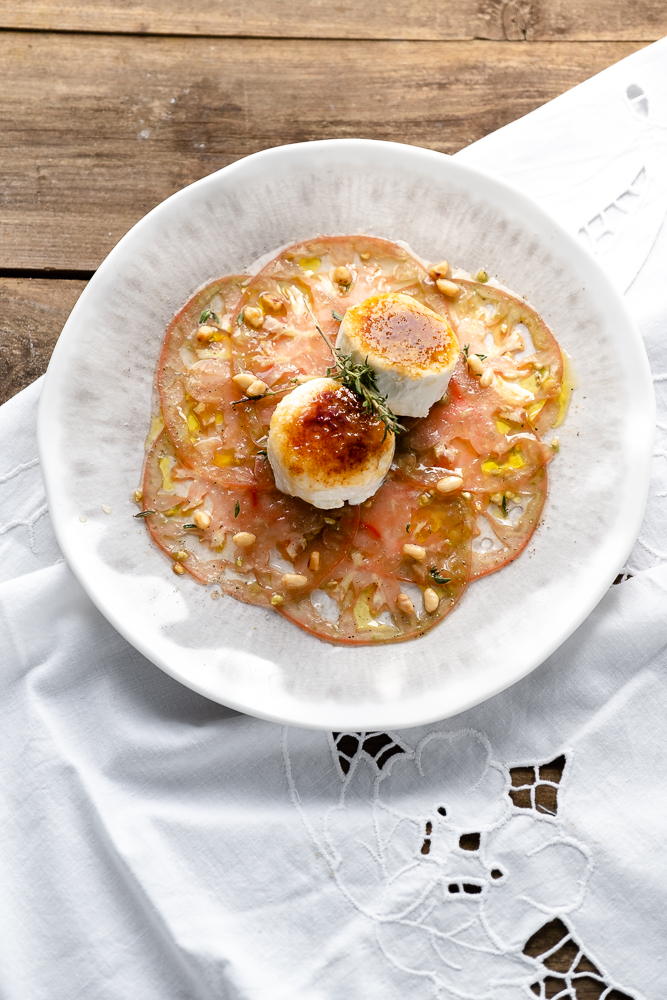 Tomaten-Carpaccio und karamellisierter Ziegenkäse